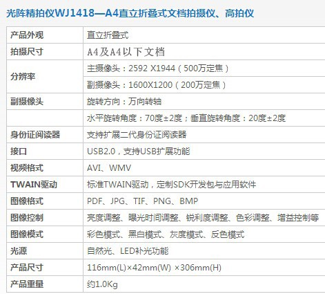 廣東光陣,中國最大高拍儀生產(chǎn)廠家 精拍儀是一款辦公領(lǐng)域革新性產(chǎn)品,她具有折疊式的超便捷設(shè)計,一秒鐘完成高速掃描, 具有OCR文字識別功能,可以將掃描的照片識別轉(zhuǎn)換成word、Excel等多種文檔,準(zhǔn)確率達95%以上。還能進行拍照、錄像、復(fù)印、實物投影、網(wǎng)絡(luò)無紙傳真等操作。她完美的解決方案讓辦公更輕松、更快捷、更環(huán)保。廣泛應(yīng)用于政府部門、醫(yī)學(xué)機構(gòu)、航天航空,金融行業(yè)(銀行、證券、保險),學(xué)校等有文件需掃描歸檔或復(fù)印存檔的領(lǐng)域。