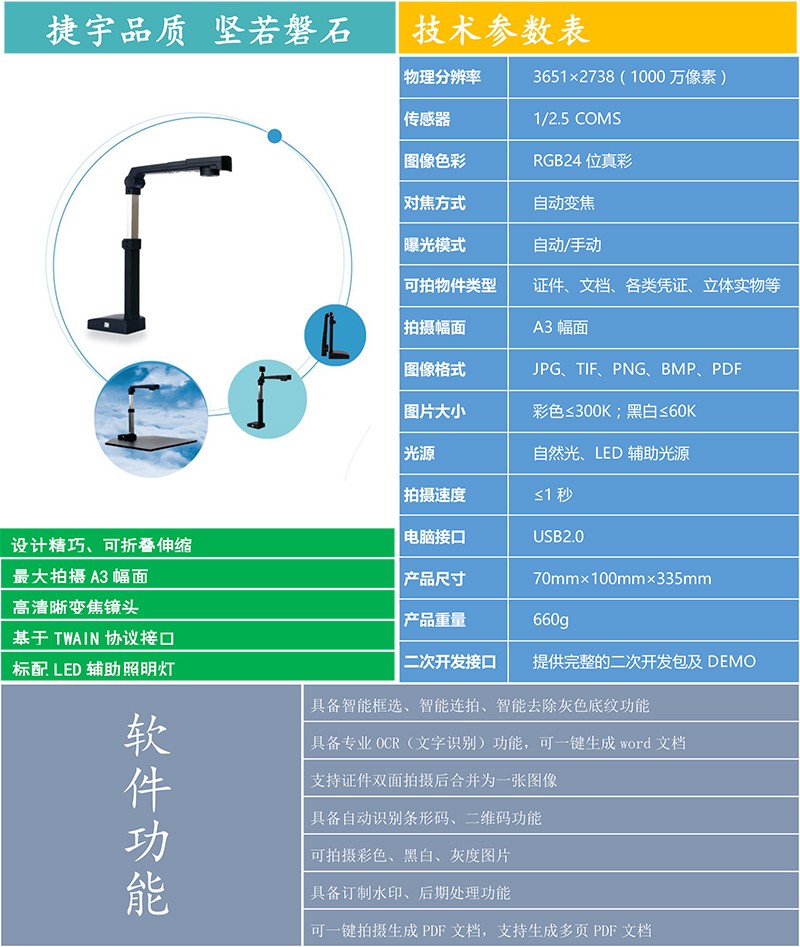 “捷易拍”品牌的高拍儀產(chǎn)品可以完全取代傳統(tǒng)平板掃描儀,除了在各項性能指標(biāo)上優(yōu)于傳統(tǒng)掃描儀之外,更具備了體積小、無機(jī)械損耗、不用外接電源等傳統(tǒng)掃描儀無法實現(xiàn)的優(yōu)點!
