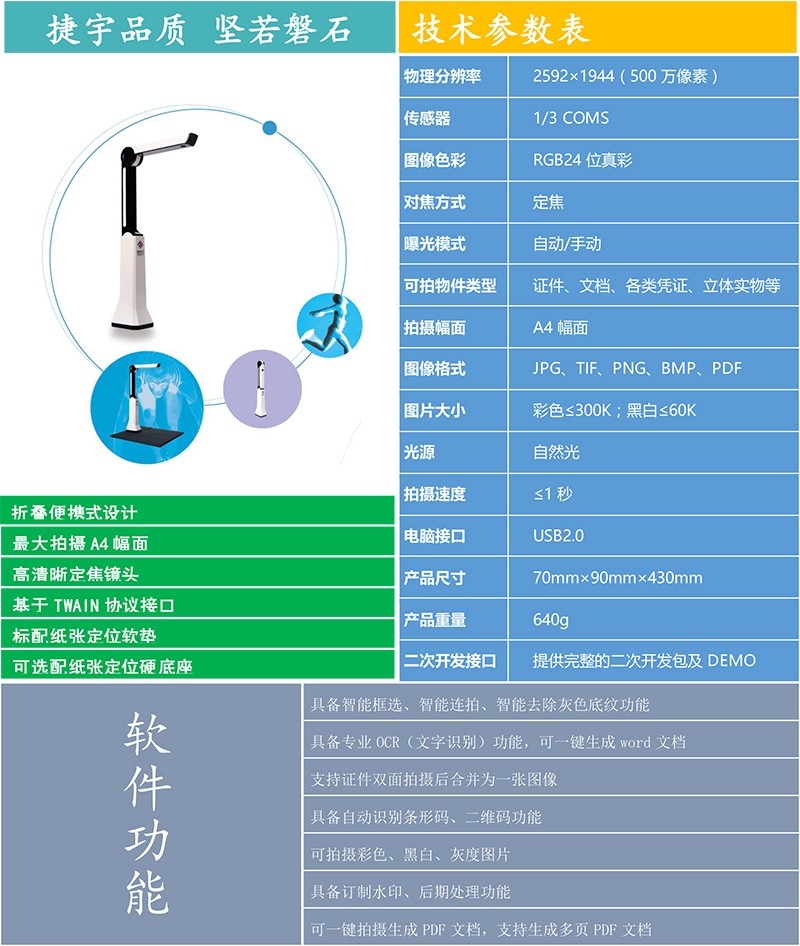 “捷易拍”品牌的高拍儀產(chǎn)品可以完全取代傳統(tǒng)平板掃描儀,除了在各項(xiàng)性能指標(biāo)上優(yōu)于傳統(tǒng)掃描儀之外,更具備了體積小、無(wú)機(jī)械損耗、不用外接電源等傳統(tǒng)掃描儀無(wú)法實(shí)現(xiàn)的優(yōu)點(diǎn)!