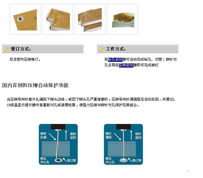 具有鉆孔裝訂能力強,鉆孔直徑小,壓鉚翻帽小,不傷字跡,裝訂精致、牢固,易翻閱等特點。